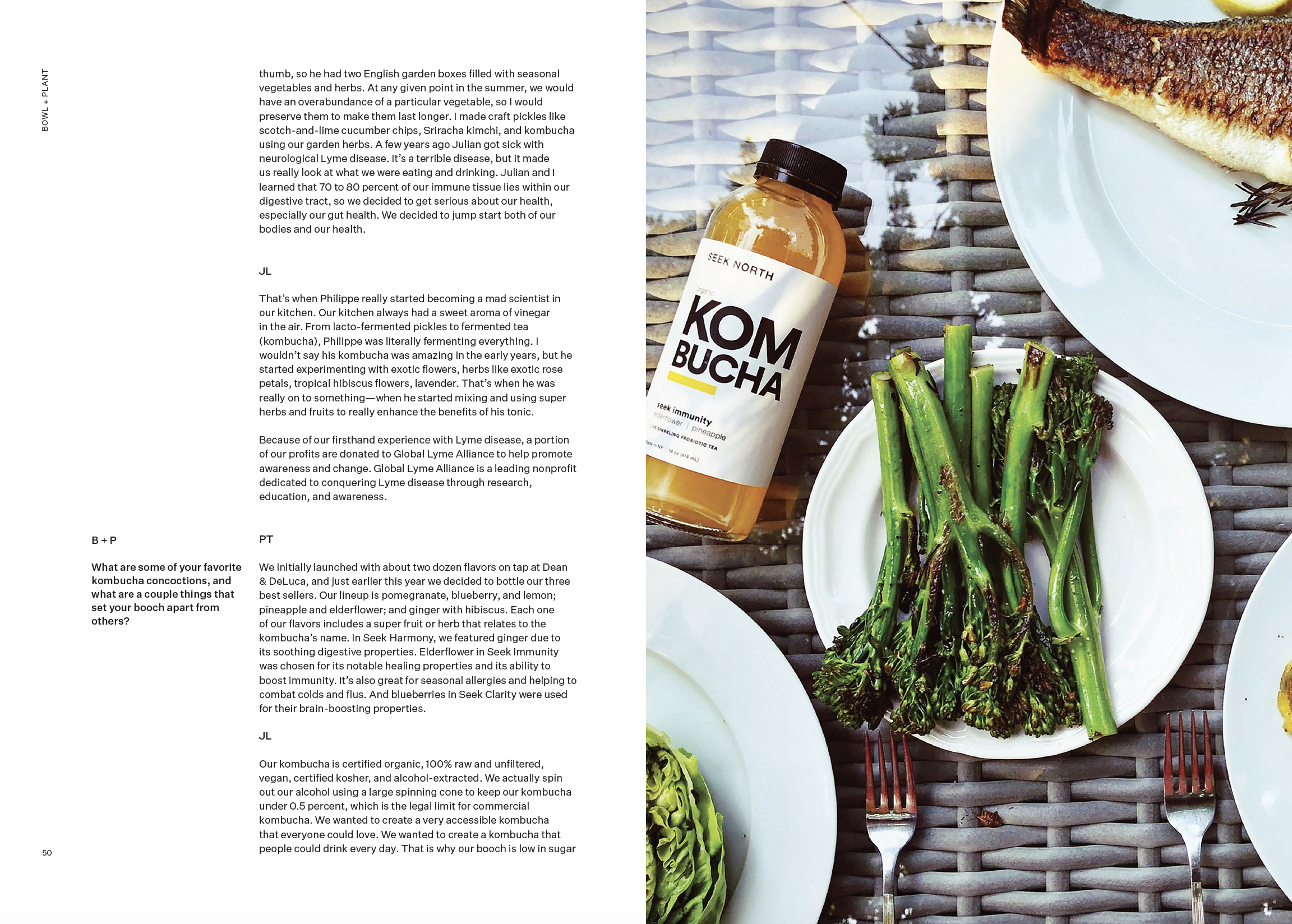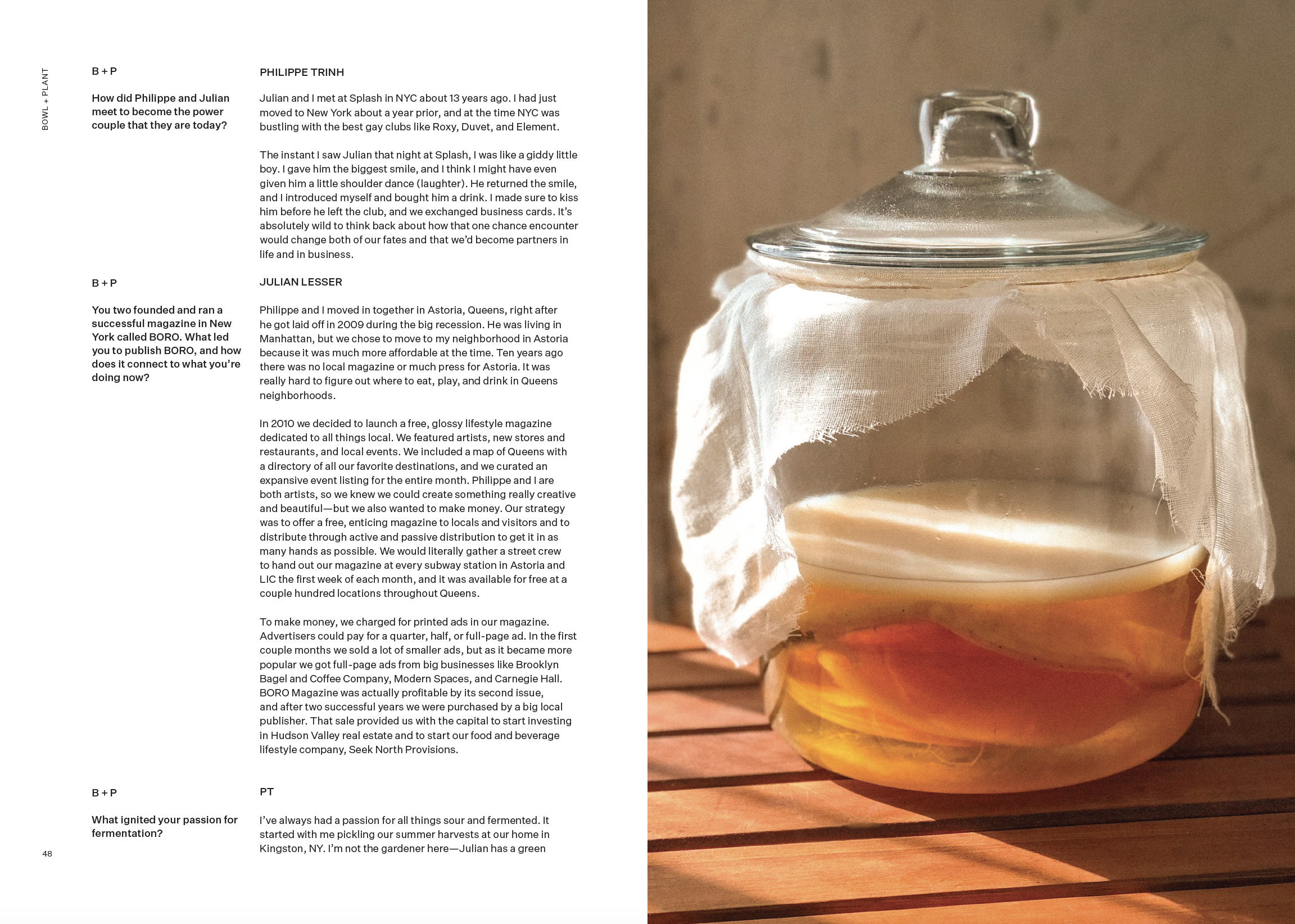 Philippe Trinh and Julian Lesser are creatives with a wealth of combined experience in the fashion and digital marketing industries, which helped them on their path to serendipitously becoming entrepreneurs. Their journey to creating amazing kombucha began with BORO, a magazine that served as a guide to local destinations, artists, and restaurants in New York’s Western Queens region. BORO paved the way for Philippe and Julian to invest in Hudson Valley real estate, which laid the financial foundation for the two to start their specialty food & beverage lifestyle company, Seek North Provisions. They reside in Manhattan during the week and retreat to Hudson Valley on the weekends with their rescue pup, Coco. Bowl and Plant Magazine recently sat down with Trinh and Lesser to learn about the beginning of their story together, the process of launching their kombucha business, and the challenges and triumphs that have helped them grow as entrepreneurs.